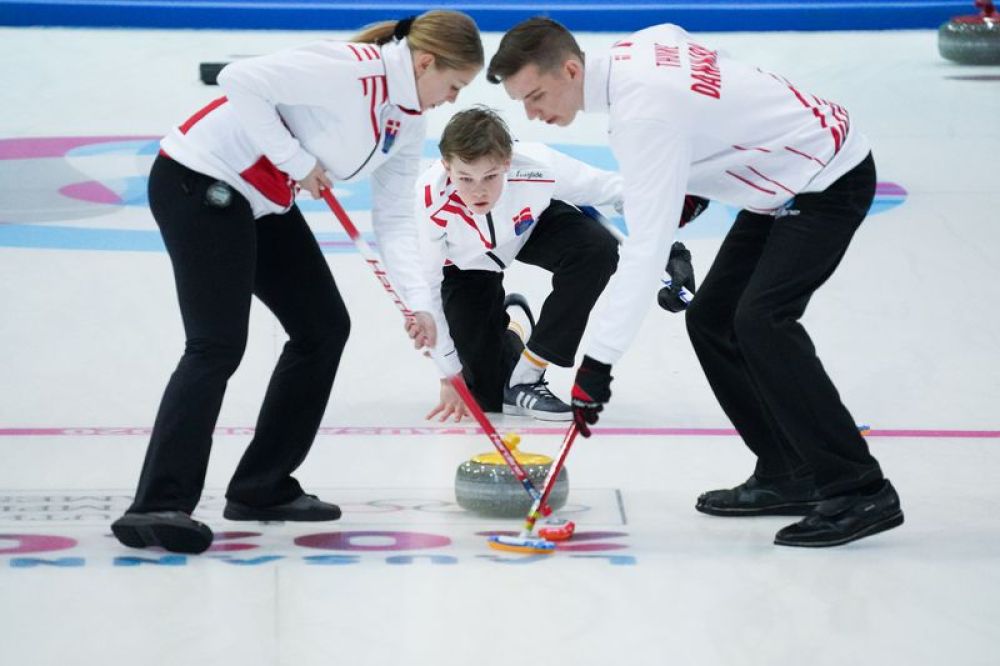 1月14日,中国队选手翟志鑫(左)和裴君杭在比赛中。当日,第三届冬季青年奥林匹克运动会冰壶混合团体赛B组循环赛在瑞士尚佩里冰壶馆举行,中国队以3比9不敌丹麦队,无缘四分之一决赛。新华社记者白雪骐摄